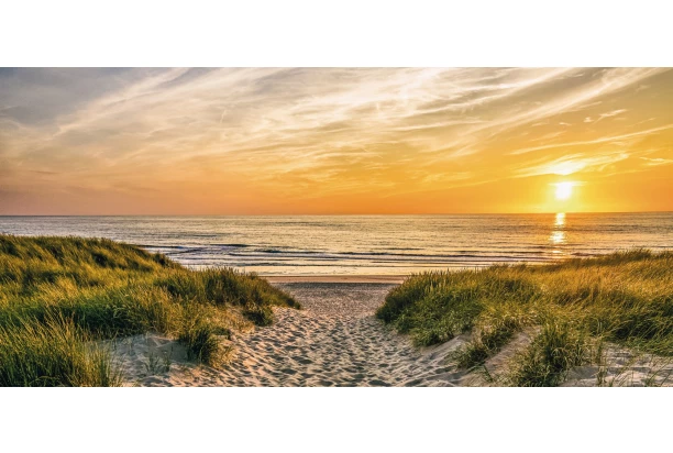 Panoramatický obraz tlačený na plátne o rozmere 70×33 cm oživí každú stenu a vnesie do Vášho domova príjemnú a relaxačnú atmosféru. Motív piesočnatej cesty vedúcej k morskej pláži pri západe slnka pôsobí upokojujúcim dojmom a dodá miestnosti útulnosť aj letnú pohodu.