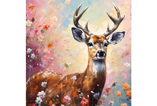 Obraz tlačený na plátne o rozmere 35×35 cm vnesie do vášho domova dotyk prírody a umeleckej elegancie. Štvorcový formát prepája vznešenú krásu lesnej zveri s jemnými pastelovými kvetmi a vytvára tak výrazný dekoratívny prvok, ktorý oživí každú stenu. Vďaka vernému efektu olejomaľby je ideálnym doplnkom pre moderné, škandinávske aj romanticky ladené interiéry.