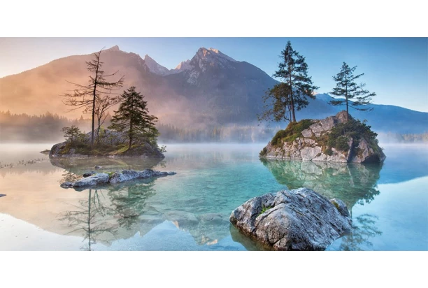 Obraz tlačený na plátne o rozmere 100×50 cm s motívom horskej krajiny vnesie do interiéru atmosféru pokoja a harmónie. Tento obraz zachytáva pohľad na bavorské jazero Hintersee v ranných lúčoch.