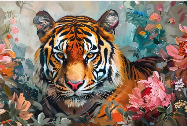 Obraz tlačený na plátne o rozmere 90×60 cm sa stane dominantným prvkom akéhokoľvek interiéru. Umelecké dekoratívne prevedenie v olejomaľbovom štýle s motívom tigra obklopeného kvetmi prepája silu divokej šelmy s jemnosťou pastelových farieb a vytvára tak pôsobivý vizuálny kontrast.