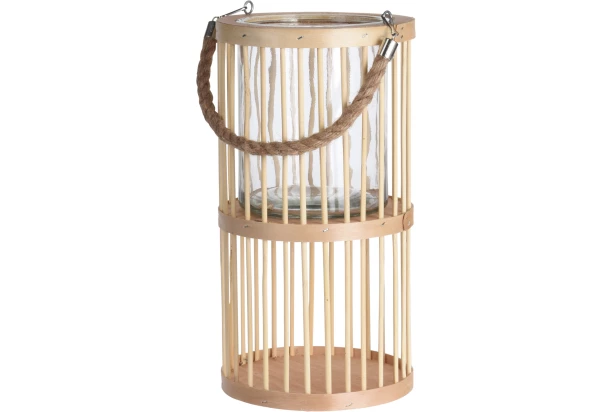 Elegantný bambusový lampáš s povrazovým uchom vnesie do Vášho domova kúsok prírody. Jeho minimalistický dizajn a prírodné materiály vytvoria útulnú atmosféru v každom interiéri aj exteriéri. Vertikálne bambusové tyčky navyše vykúzlia pôsobivú hru svetla a tieňov. Rozmer 16×30 cm.