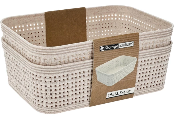 Praktická sada obsahuje 2 štýlové košíky z plastu vo svetlo béžovej farbe s tkaným dizajnom. Ideálne na ukladanie drobností v kuchyni, kúpeľni či inej miestnosti – všetko prehľadne po ruke a bez neporiadku. Rozmer košíka 19×6×13, 5 cm.