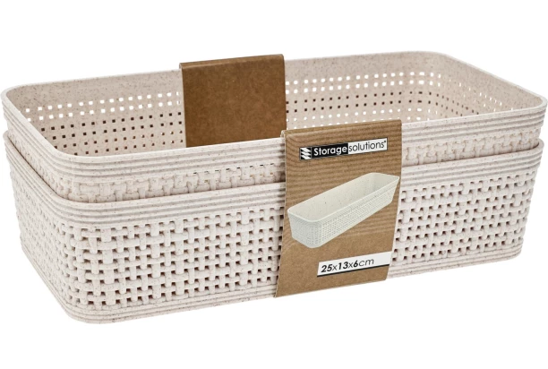 Praktická sada obsahuje 2 štýlové košíky z plastu vo svetlo béžovej farbe s tkaným dizajnom. Ideálne na ukladanie drobností v kuchyni, kúpeľni či inej miestnosti – všetko prehľadne po ruke a bez neporiadku. Rozmer košíka 25,3×6×13,3 cm.