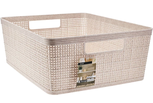 Štýlový úložný košík z plastu vo svetlo béžovej farbe s tkaným dizajnom. Ideálne na ukladanie drobností v domácnosti – všetko prehľadne po ruke a bez neporiadku. Rozmer košíka 35×13×29 cm.