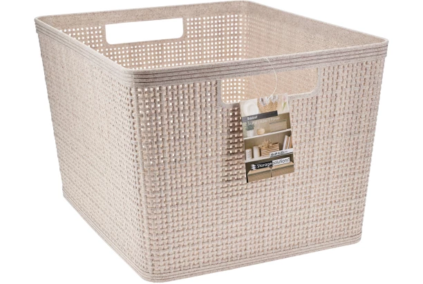 Štýlový úložný košík z plastu vo svetlo béžovej farbe s tkaným dizajnom. Ideálne na ukladanie drobností v domácnosti – všetko prehľadne po ruke a bez neporiadku. Rozmer košíka 35×22×29, 5 cm.