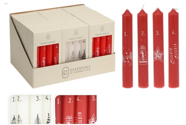 Súprava štyroch adventných sviečok je krásnym doplnkom pre sviatočné obdobie. Každá sviečka nesie číslo a jedinečný vianočný motív, vďaka čomu ľahko navodíte hrejivú a útulnú atmosféru po celé štyri týždne adventu. Dodávané v červenej alebo bielej farbe.