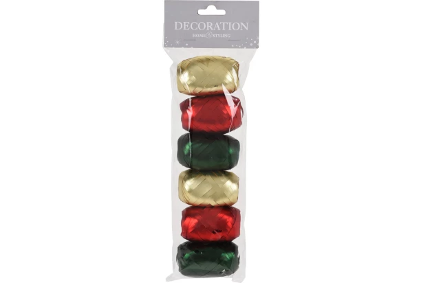 Sada obsahuje 6 stužiek v rôznych vianočných farbách (červená, zelená, zlatá) a vzoroch. Stuhy sú ideálne na balenie darčekov alebo vytváranie vianočných dekorácií.