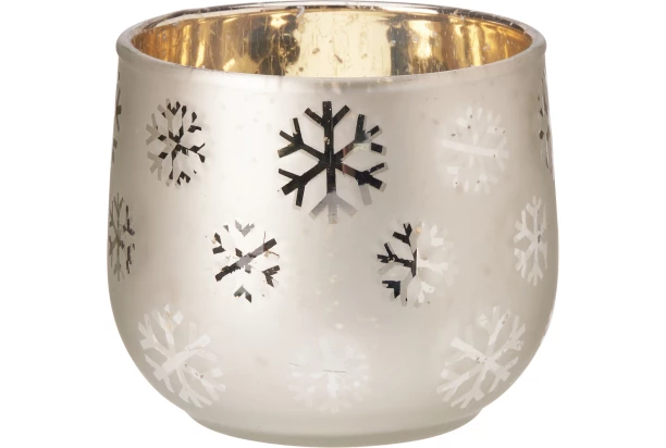 Elegantný sklenený svietnik so vzorom snehových vločiek navodí v miestnosti tú pravú zimnú vianočnú atmosféru. Jeho luxusná zlatá povrchová úprava po zapálení čajovej sviečky krásne odráža teplé svetlo a vytvára útulnú žiaru. Výška 10 cm.