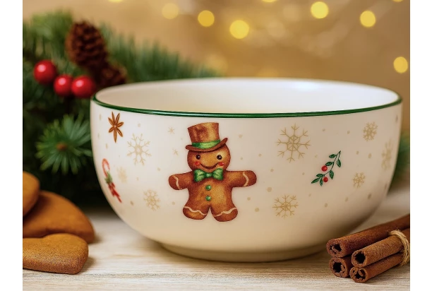 Táto elegantná a sviatočne ladená miska s objemom 500 ml je ideálna na spríjemnenie vianočných chvíľ. Je vyrobená z kvalitného porcelánu a zdobia ju nádherné vianočné motívy, roztomilý perníček a ďalšie symboly Vianoc.