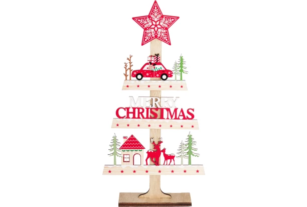 Vianočná dekorácia v tvare stromčeka s výškou 30 cm vnesie do každého interiéru sviatočnú atmosféru. Drevený poschodový stromček je ozdobený pestrými vianočnými motívmi a nápisom MERRY CHRISTMAS, a preto skvele doplní Vašu výzdobu.