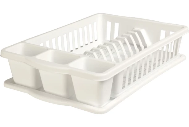 Biely odkvapkávač na riad je praktickým a elegantným doplnkom do každej kuchyne. S rozmermi 39,5×8,5×26 cm ponúka dostatok miesta na sušenie tanierov, misiek aj príborov. Odkvapkávač je vybavený tromi priehradkami na príbory a lyžice, čo uľahčuje organizáciu a rýchle schnutie. Spodná tácka zachytí prebytočnú vodu, takže vaša kuchynská linka zostane suchá a čistá.