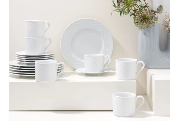 Elegantný 18-dielny kávový servis z kvalitného porcelánu je ideálnou voľbou na každodenné posedenie pri káve i na slávnostné príležitosti. Riad je ozdobený jemným plastickým reliéfom, ktorý mu dodáva moderný vzhľad. Vďaka čisto bielej farbe sa navyše skvele hodí do každého interiéru.