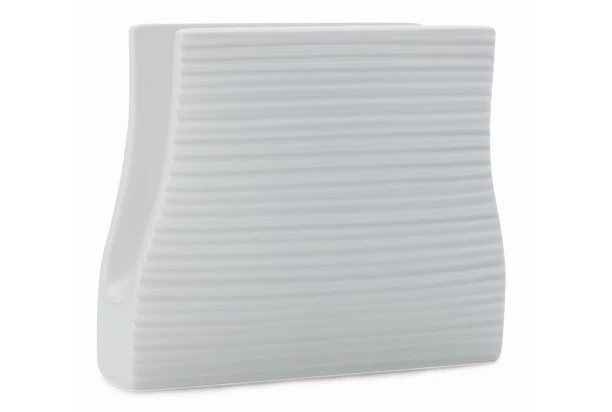 Porcelánový stojanček na obrúsky v elegantnej bielej farbe zaujme svojim hranatým tvarom a jemným vrúbkovaným dekorom.