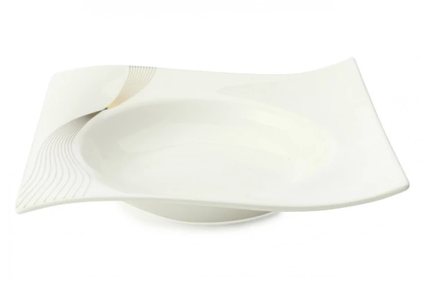 Porcelánový štvorcový hlboký tanier 22×22 cm so zlatým vlnitým dekorom je vhodný na slávnostné príležitosti i každodenné použitie. Riad z elegantnej kolekcie Frequency zaujme svojim výrazným atypickým hranatým tvarom s jemne zaoblenými hranami.