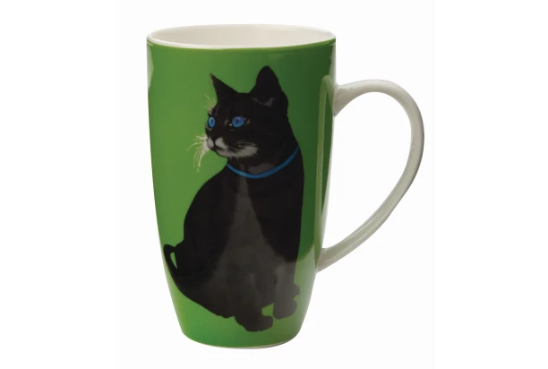 Praktický a štýlový hrnček s objemom 420 ml je vyrobený z porcelánu a zdobí ho motív čiernej mačky na zelenom pozadí.
