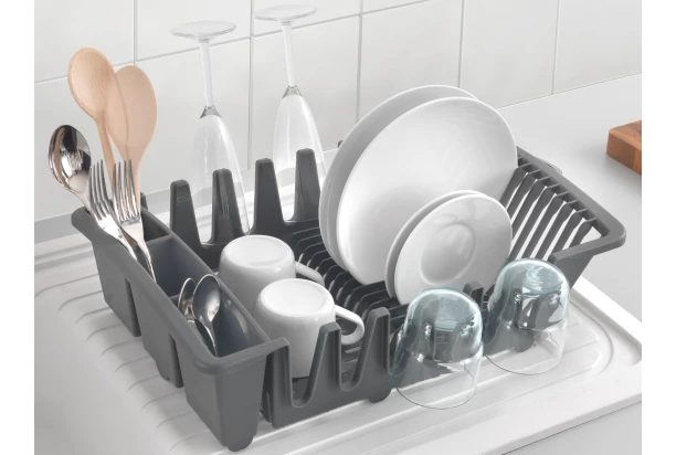 Odkvapkávač v šedej farbe je praktický pomocník do kuchyne, ktorý zjednoduší sušenie riadu a pomôže udržať pracovnú plochu suchú a organizovanú. Vďaka šikovnému rozdeleniu na sekcie je možné ľahko usušiť taniere, hrnčeky, poháre, príbory aj fľaše.