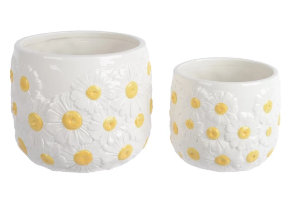 Sada 2 kvetináčov s jemným motívom kvetov harmančeka či margaréty vnesie do vášho domova jarnú atmosféru. Obaly na kvetináč sú ručne vyrobené z dolomitu a vďaka rozdielnej výške pôsobia pri aranžovaní prirodzene a harmonicky.