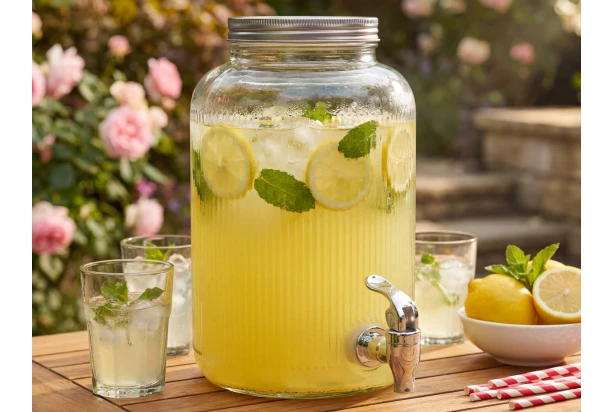 Sklenený dávkovač na nápoje s objemom 4 l je skvelý na letné párty, oslavy alebo iné príležitosti. Jemné vertikálne ryhovanie skla vytvára zaujímavé svetelné efekty a dodáva nádobe textúru. Džbán s vekom a kohútikom je praktický doplnok, s ktorým si ľahko vychutnáte akýkoľvek nápoj.