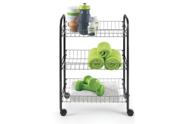 Univerzálny pojazdný regál s 3 košíkmi je praktickým riešením na rozšírenie úložného priestoru nielen v kuchyni. Viacúčelový vozík na kolieskach je možné využiť ako servírovací stolík, ale taktiež ponúka dostatok miesta pre kúpeľňové potreby, čistiace prostriedky alebo kancelárske doplnky. Povrchová úprava kovová šedá/čierna.