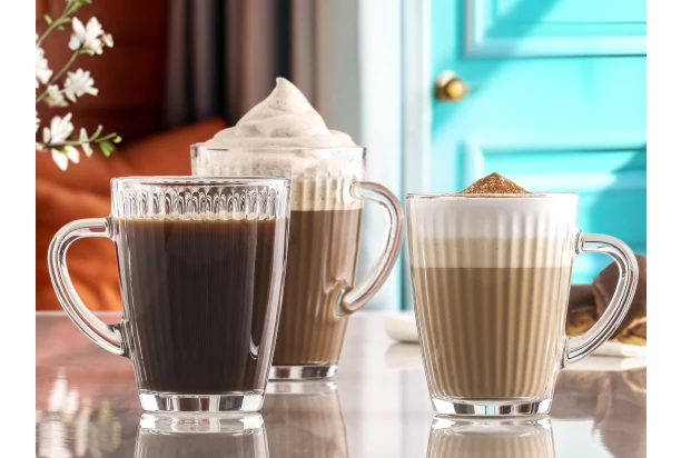 Sklenený hrnček s vrúbkovaním je ideálny pre kávu alebo čaj. Objem 400 ml.