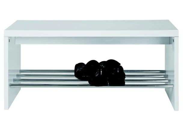 Univerzálna lavica s odkladacou priehradkou na topánky skvele zapadne do každej predsiene. Vyrobená v kombinácii bieleho lesku a chrómovo lesklého kovu.