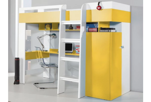 Zvýšená posteľ s veľkosťou lôžka 90×200 cm s dolným úložným priestorom a písacím stolom z programu Mobi. Posteľ má nápadito riešenú konštrukciu v kombinácii farieb biela/žltá. Získate tak na malej ploche kompletné útulné zákutia pre vybavenie izby detí alebo tínedžerov.