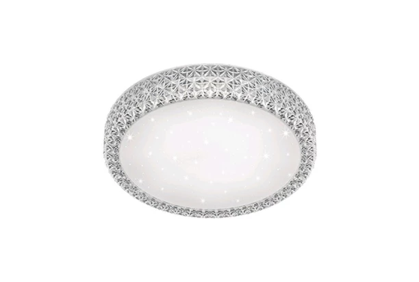 Elegantná stropná LED lampa s okrajom imitujúcim brúsené sklo. Farba svetla a intenzita sú možné upravovať pomocou diaľkového ovládača.