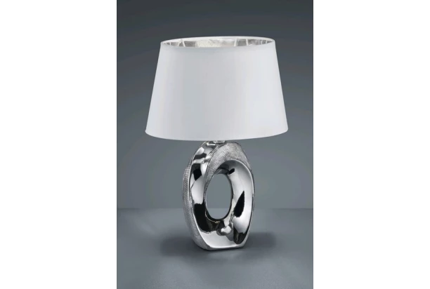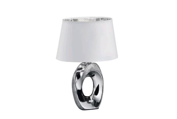 Luxusná stolová lampa s zaoblenou konštrukciou a bielym tienidlom, ktoré je z vnútornej strany doplnené chrómovou farbou. Vhodne doplní Váš štýlový interiér obývačky, spálne alebo akéjkoľvek chodby. Výška 33 cm.