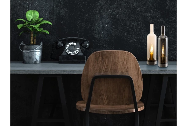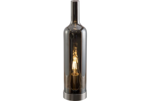 Štýlová stolná lampa v tvare sklenenej fľaše veľmi dobre poslúži aj ako zaujímavý dekoračný prvok pre Váš domov. Z dymového skla a kovu. Ideálny na doplnenie obývačky, jedálne alebo i kuchyne.
