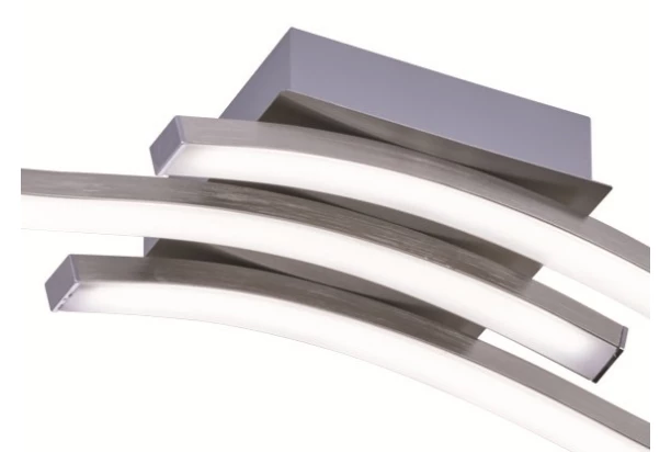 Moderné stropné LED osvetlenie má elegantne zakrivený dizajn v tvare vlnoviek a vďaka technológii LED je veľmi úsporné. Farebná kombinácia matného niklu a bieleho tienidla ľahko zapadne do modernej spálne alebo obývačky. Variant s tromi svietidlami.