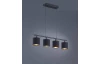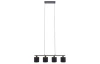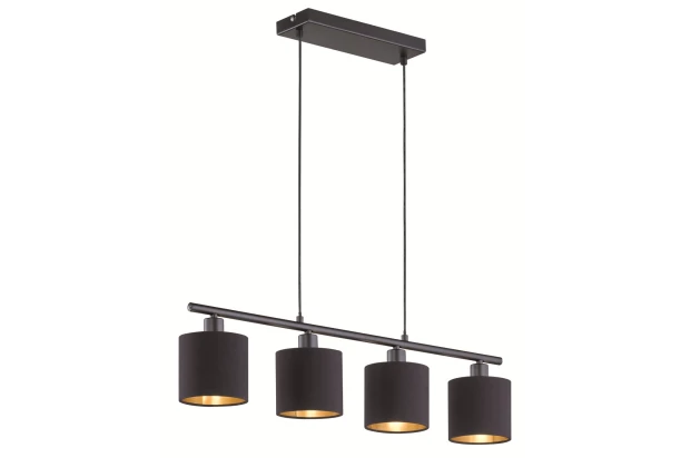 Závesné stropné osvetlenie zo série Tommy v jednoduchom, ale modernom štýle, vykúzli v každej domácnosti útulnú atmosféru. Lampa je vyrobená z kovu v prevedení čierny mat a je doplnená štyrmi svietidlami s čierno-zlatými látkovými tienidlami, ktoré sú polohovateľné. Šírka 75 cm je ideálna pre umiestnenie doprostred nad jedálenský stôl. Posuvné laná Vám umožnia nastavovať výšku osvetlenia podľa potreby.