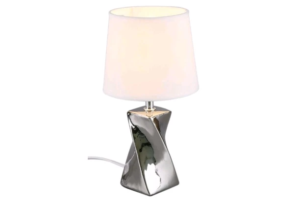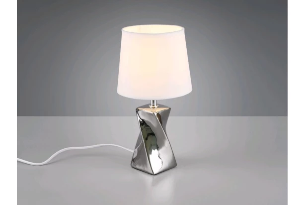 Stolná lampa zo série ABEBA ,vyniká elegantným dizajnom. Má zakrivený keramický podstavec v lesklom striebornom prevedení a klasické tienidlo z bielej látky. Svetlo sa ovláda pomocou káblového vypínača.