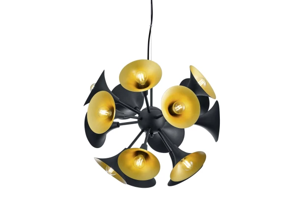 Nevšedný a extravagantný závesný luster sa stane skutočným pútačom, ktorý vykúzli v miestnosti krásne svetelné efekty. Svietidlo sa skladá z 15 kovových tienidiel v tvare rúrky, ktoré sú zoskupené do tvaru gule. Kombinácia čiernej a zlatej farby dodáva lampe moderný vzhľad.