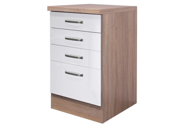 Dolná kuchynská zásuvková skrinka so šírkou 50 cm z elegantného kuchynského programu Valero – útulnú kombináciu dekoru dub sonoma a bielej farby vo vysokom lesku dopĺňa zaoblený kovový úchyt v nerezovom vyhotovení. Elementy kuchynského programu Valero môžete medzi sebou ľubovoľne kombinovať a zostaviť si tak kuchyňu podľa vašich individuálnych potrieb a priestorových možností.