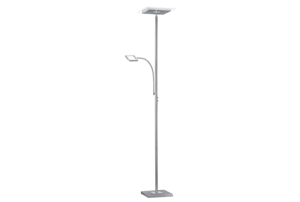 Kovovú stojaciu lampu v matnom niklovom prevedení s 2 akrylovými tienidlami možno ľahko kombinovať s mnohými štýlmi vybavenia. Okrem hlavného osvetlenia má lampa navyše bočné svietidlo, ktoré poskytne výborné svetlo na čítanie, a preto je ideálne túto lampu umiestniť vedľa pohovky alebo kresla. Vďaka flexibilnému nastaveniu lampy je možné ľubovoľne nasmerovať zdroj svetla. Výška 182 cm.