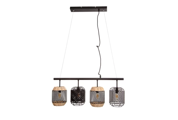 Závesné stropné osvetlenie má 4 drôtené tienidlá v odlišnom vzhľade, z ktorých dve sú navyše opletené prútím. Stropná lampa zaujme svojim štýlovým dizajnom a po rozsvietení vykúzli v obývacej izbe alebo jedálni krásnu hru svetiel a tieňov.