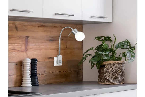 LED lampička do zásuvky má jednoduchý dizajn a flexibilné možnosti použitia. Lampa bez prívodového kábla je veľmi praktická, nezaberie žiadne miesto na stole a skvele sa hodí do existujúcej zásuvky napríklad nad nočný stolík alebo na osvetlenie kuchynskej linky. Rameno svietidla je flexibilné a je možné ho individuálne nasmerovať podľa vlastných potrieb. Je možné tiež zvoliť rôznu intenzitu svetla (100 % – 60 % – 40 % – 20 %). Okrúhle sklenené tienidlo v bielej farbe dobre ladí s konštrukciou v prevedení matný nikel.