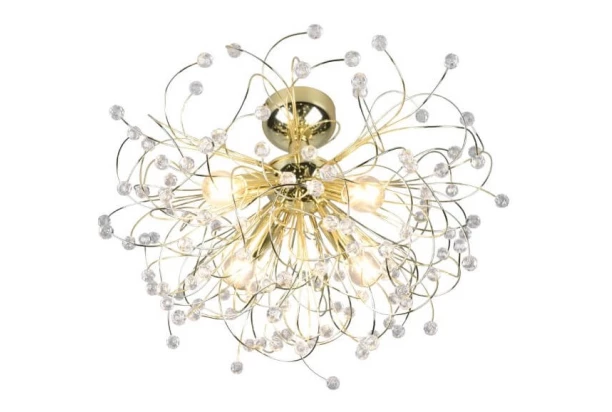 Elegantné stropné osvetlenie je vyrobené z kovu v mosadznej farbe a má niekoľko prepletených ramien s ozdobnými prvkami, ktoré pripomínajú krištáľy. Originálne designové svietidlo sa hodí do moderného interiéru, ktorému dodá nádych luxusu. Variant so 4 svietidlami.