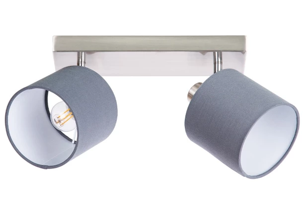 Stropné osvetlenie s 2 svietidlami je praktickým aj dekoratívnym bytovým doplnkom. Kovová konštrukcia v prevedení matný nikel dokonale ladí s látkovými tienidlami v šedej farbe s priemerom 12 cm. Lampa poskytne príjemné osvetlenie u Vás doma.