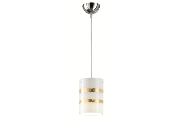 Elegantný závesný luster zo série Nikosia má sklenené tienidlo s priemerom 14 cm, ktoré je ozdobené dekoratívnymi zlatými pruhmi so zámernými stopami po roztrhnutí. Stropná lampa sa skvele hodí do kuchyne, jedálne alebo obývačky.