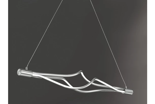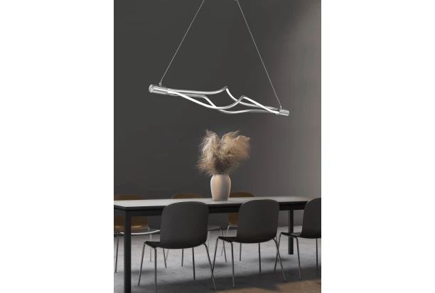 Dizajnové stropné LED osvetlenie z kombinácie kovu a bieleho akrylu je zavesené na posuvných lanách, ktoré umožnia nastavovať výšku podľa potreby. Závesná lampa zaujme svojim elegantne zakriveným tvarom a ľahko zapadne do klasických aj moderných interiérov. Je možné nastavovať aj intenzitu a farbu svetla.