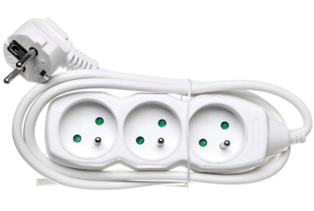 Biely predlžovací prívod s 3 zásuvkami s dĺžkou 1,5 ma s prierezom vodiča 1 mm². Vhodný pre maximálnu záťaž 10 A max. Predlžovací prívod 1,5 m na 230 V~ slúži na predĺženie elektrickej energie tam, kam pevná zásuvka nedosiahne. Pri montáži na stenu je nutné použiť skrutku so zapustnou hlavou PZ max. priemer 2,5–3 mm, dĺžka 30–40 mm. V prípade použitia iného priemeru hrozí poškodenie plastovej časti otvoru. Pokiaľ dôjde k poškodeniu plastovej časti otvoru, predlžovací prívod nepoužívajte.