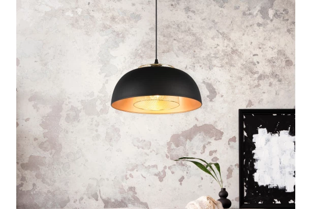 Jednoduché závesné svietidlo zaujme svojim industriálnym vzhľadom a dokonale sa hodí do moderného, puristického interiéru vašej kuchyne alebo jedálne. Veľké tienidlo, doplnené zvnútra druhým, menším tienidlom s mriežkovým vzhľadom ako dizajnovým prvkom, je krásne zvýraznené a vytvára špeciálne svetelné efekty. Štýlový tvar a farebné prevedenie svietidla v matnej čiernej a zlatej farbe dodá vášmu domovu industriálnu atmosféru.