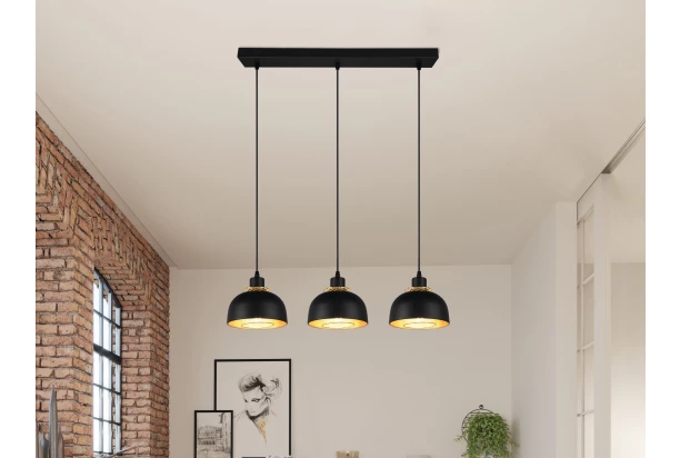 Závesné osvetlenie s 3 svietidlami zaujme svojím industriálnym vzhľadom a dokonale sa hodí do moderného, puristického interiéru vašej kuchyne alebo jedálne. Veľké tienidlá, každé zvnútra doplnené druhým menším tienidlom s mriežkovým vzhľadom, vytvárajú krásne svetelné efekty. Štýlový tvar a farebné prevedenie svietidla v matnej čiernej a zlatej farbe dodá vášmu domovu industriálnu atmosféru.