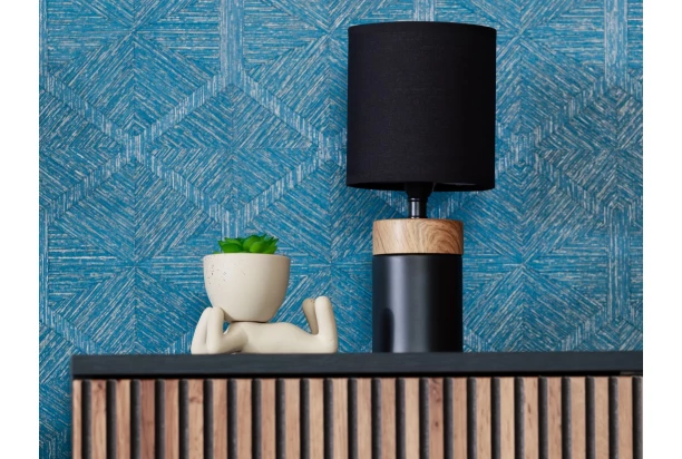 Táto elegantná stolná lampa zaujme svojim krásnym farebným prevedením. Na matne čiernom valcovom podstavci z kovu s imitáciou textúry a farby dreva je pätica E14, ktorou prekrýva čierne textilné tienidlo s priemerom 14 cm. Vďaka svojmu unikátnemu vzhľadu sa stane nielen štýlovým prvkom, ale aj praktickým zdrojom svetla na rôzne účely. Celková výška 29 cm.