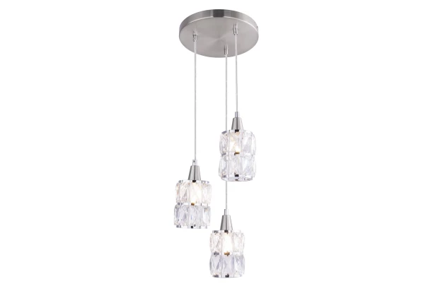 Závesné stropné osvetlenie s očarujúcim vzhľadom je vyrobené z matného niklu. 3 sklenené krištáľové tienidlá sú zavesené v rôznych (nastaviteľných) výškach a sú diskrétne zdobené chrómovými pásikmi. Luster vyzerá úžasne, aj keď je vypnutý.