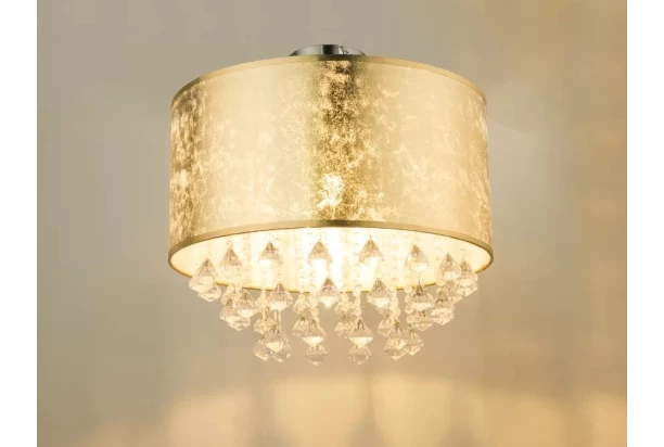 Elegantné a moderné stropné svietidlo s priemerom 40 cm zo série Amy je vhodné do mnohých veľkostí miestností. Textilné tienidlo zlatej farby má metalickú povrchovú úpravu a vďaka rôznym priehľadnostiam získava dodatočný lesk. Osvetlenie je ozdobené hustým zavesením akrylových kryštálov, ktoré lámu svetlo a vytvárajú malé dúhy na strope a stenách. Lampa tak dodáva miestnosti iskrivý a luxusný vzhľad.