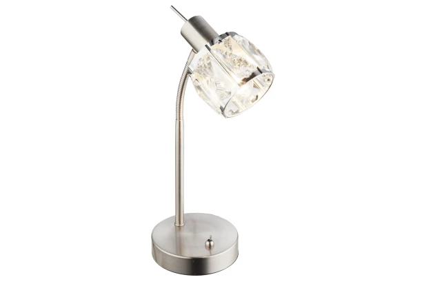 Stolová lampa zo série Kris kombinuje kovovú základňu v matnom prevedení a elegantné tienidlo z jemných sklenených kryštálov orámovaných v pochrómovanom kove. Lampička je vybavená flexibilným ramenom pre ľahké polohovanie.