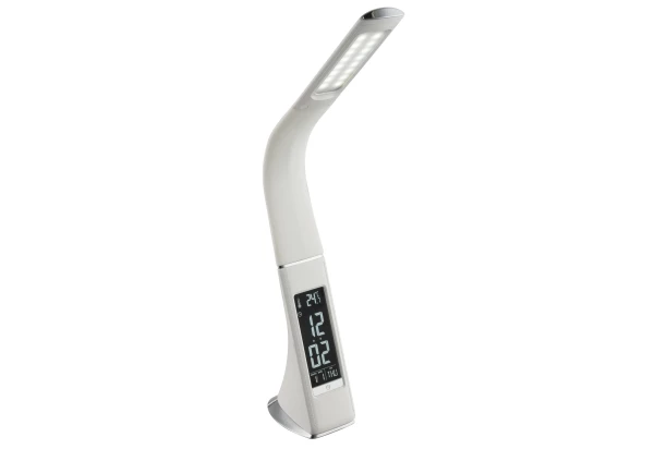 Moderná LED stolná lampička je vyrobená z pochrómovaného kovu a bieleho plastu. Farbu svetla je možné nastaviť od teplého bieleho svetla až po denné svetlo, ktoré je ideálne na sústredenie pri práci. Na lampe je displej s izbovou teplotou, aktuálnym časom a je možné si tiež nastaviť budík. Vďaka ohybnému ramenu je možné svetlo nasmerovať podľa Vašich potrieb, a preto sa lampička hodí na čítanie alebo na písací stôl.