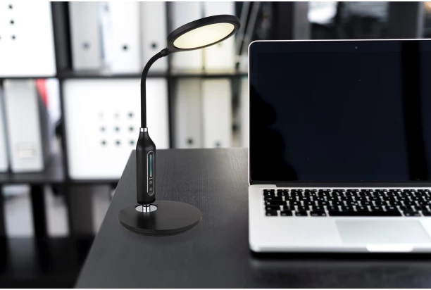 Moderná LED stolová lampa zo série Fruggy zaujme nielen svojim dizajnom, ale aj funkciami. Lampička s výškou 40,7 cm je vyrobená z matne čierneho plastu a pochrómovaného kovu. Farbu svetla je možné nastaviť od teplého bieleho svetla až po denné studené svetlo, ktoré je ideálne na sústredenie na prácu. Lampu je možné plynule stmievať v 3 stupňoch jasu, vypínať a zapínať pomocou dotyku a vďaka pamäťovej funkcii sa uloží posledné zvolené nastavenie osvetlenia. Vďaka ohybnému ramenu je možné svetlo nasmerovať podľa Vašich potrieb, a preto sa lampička hodí na čítanie alebo na písací stôl.